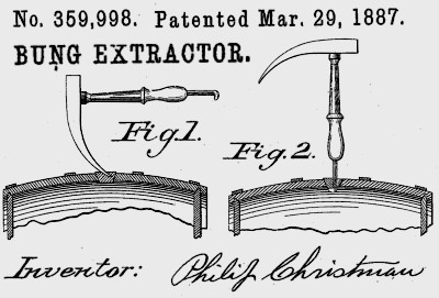 | "With the pointed end of the tool I cut out a part of the bung, thus making an orifice through it, and through this orifice I insert the hooked end of the tool. By turning the tool on a vertical axis until the hook comes under the part of the bung remaining in the cask, I am enabled to pull out this part of the bung."