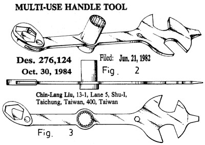 The varied tools as produced differ from the design shown -- no central "socket;" some have swinging hook jaw rather than "loop," number and size of open end wrench slots differs, etc. The version with the "swinging loop" has a different R.O.C. patent number.
