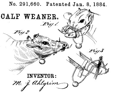 The patent is noted in illustrations for the HOOSIER AUTOMAITC WEANERS produced by BARBEE WIRE and IRON WORKS. Those weaners also include features from Ahlgrim's subsequent patent 353,411.