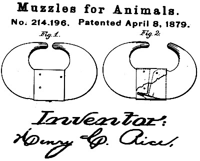 Wooden side pieces with a central metal frame and latch. This would hang down from the nostrils far enough to prevent sucking as the animal's head was raised, but swing forward to allow grazing and drinking. Period ads show three sizes produced, and several sources name Rice as the manufacturer.