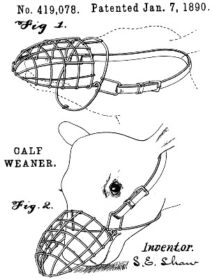 Advertising notes the smooth muzzle does not irritate or injure the udder which is the target of the attempted sucking. An 1892 write-up for Shaw's Calf Weaner names the manufacturer. |