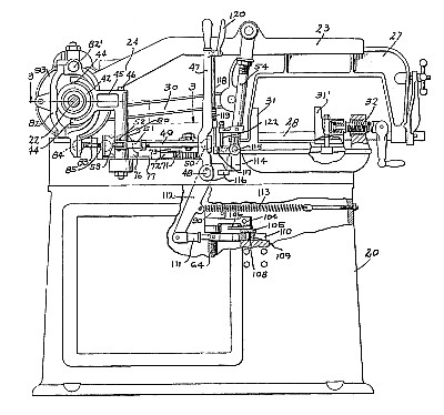 In a metal sawing machine, the combination with a saw and its frame and means for reciprocating the same, of positive feed means for the saw comprising a screw shaft, a split nut on said shaft operatively connected to said saw frame, means for effecting the engagement and disengagement of the sections of said nut comprising a manually-controlled lever and connections between said lever and the sections of said nut, a pivoted latch engageable with said lever for maintaining said lever in nut-engaging position and including an oscillatory shaft provided with spaced arms, a movable member carried by said lever and manually operable independently of the movement of said lever to engage one of said arms to release said latch, and a member movable with the saw frame and engageable with the other of said arms to release said latch when the saw reaches a predetermined position. |