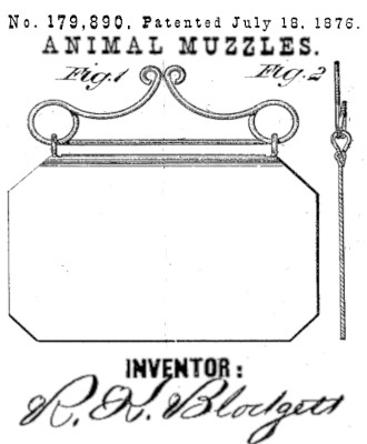 | "The calf-muzzle or anti-sucking attachment herein described, consisting of the wire spring-clamp C and the plate A, pivoted to the horizontal rod of the clamp C by loops B, as and for the purpose set forth." See also parallel patent 179,889. |