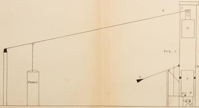 | This is perhaps the first patent for an internal combustion engine that used a liquid hydrocarbon fuel, although it does not strongly resemble a modern internal combustion engine.The inventor was a maker of varnish and the fuel he used was "coal tar, spirit or turpentine rendered gaseous and then ignited by a flame burning outside the cylinder.".One website describes this invention as "a single vertical cylinder surrounded by a coal-fired preheating furnace at the lower end and a water cooling jacket at the upper end. Vertical motion of the piston was transmitted via a connecting rod and pivoted rocking beam for driving de-watering pumps in the coal mines. Prior to each power stroke a small quantity of liquid spirits was poured into a fuel hopper connected by a supply tube to the lower end of the cylinder. A hand-operated air pump was then used to charge the cylinder with air, causing the piston to rise about 25% of its stroke. Thereafter, heat from the furnace evaporated the fuel/air mixture and produced ignition, driving the piston to the upper end of the cylinder to complete its power stroke and exert an upward push to the rocking beam. As cylinder pressure and temperature dropped, accelerated by the cooling jacket, gravity pulled the piston back down to its original position, exerting a pull on the rocking beam, which in turn, operated a plunger type pump at the other end." |