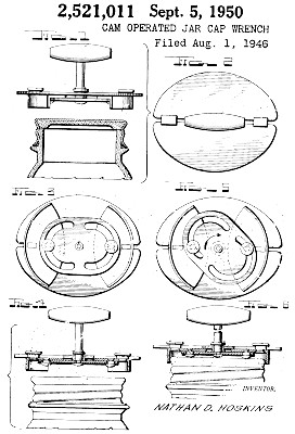 | An object of my invention is to provide a tool of this character which can be used with equal facility to apply or screw on and to loosen or screw off, the screw tops or caps of "Mason" or other screw-topped jars, and which is of such construction that it is readily applied to and removed from the jar top or cap, and with which the force employed to move and turn the jar top will tighten the wrench and assure a firm grip of the tool upon the top or cap, for both tightening the screw cap into place and removing the same."