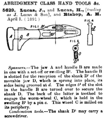 Entry based on "Abridgment;" a LUCAS "ROYAL" spanner matching the design appears in an 1894 London hardware dealer's ad. The LUCAS article in Ron Geesin's THE ADJUSTABLE SPANNER notes the patent, and no known examples.