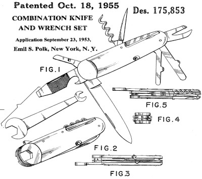 | Patent is the design for combination knife and wrench set as shown in the drawing. The small wrench slides into a metal sheath on one side.