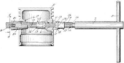 | This reamer is primarily intended for reaming connecting rods and crank-pin seats. A 1926-02-11 Motor Age article shows the Aabs Perfect expansion reamer made by "New Ulm Co." A 1931 catalog from Truth Tool Co. of Mankato, MN, features this reamer plus an Aabs Connection Rod Reaming Guide. One page for the reamer says "New Ulm Manufacturing Co." (and also says "U. S. Patent No. 648,490", which was actually the application number for this patent); another page just says "Truth Tool Company". The latter company was a substantial manufacturer of tools, including for the automobile repair shop. It is not known whether Truth Tool was the distributor for New Ulm Mfg. Co., or if they were also manufacturing the tool under license from New Ulm Mfg. Co. |