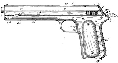 This patent is one of four issued to Browning on this date—out of 128 in total that were issued to Browning in his lifetime—that provide the ideas used by almost every modern pistol. The invention relates to "automatic breech-loading firearms" that are operated by the recoil of the breech block or bolt carrier. A mechanism is provided for such a firearm that also prevents the hammer from being released until the breech is closed and all parts are in position to discharge the cartridge, and then held in the discharged position until the trigger is released. The mechanism uses a barrel that moves longitudinally and at the same time move slightly upward so as to lock breech, move with the breech block by the recoil, and eject the spent cartridge.