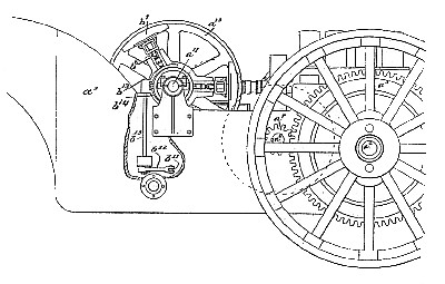 In a traction engine, the combination of a driving engine with a longitudinal driving shaft, an axle for supporting the driving engine located at right angles to said longitudinal driving shaft, a driven shaft substantially at right angles to said driving shaft, two opposing flywheels, two clutch members, Staid clutch members being on said driven shaft, means connected with said driving shaft for driving said flywheels continuously but in opposite directions, gears between said clutch members and the supporting axle, and means for operating said clutch members whereby one of said members may rotate in unison with a flywheel while the other opposing flywheel rotates continuously free from its corresponding clutch member allowing its momentum to assist the other flywheel. |