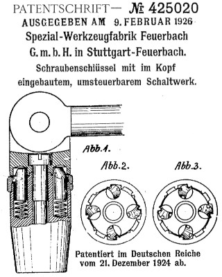 | German patent corresponding to U.S. 1,629,205 for a reversible ratchet structure in a wrench head. The ALL-IN-ONE which was distributed in the U.S. by Emil Schwarz (Chicago) incorporates this ratchet structure. In keeping with German patent conventions, the patent is issued to the company rather than a named individual.