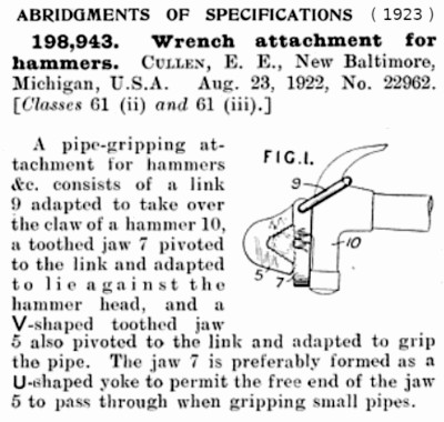 | British patent corresponding to Canadian patent CA-231,926 and U.S. 1,501,586 for a "triple jaw" pipe wrench attachment for claw hammer. The "claw" portion of the hammer slips through a loop to hold the jaws on the end of the hammer.