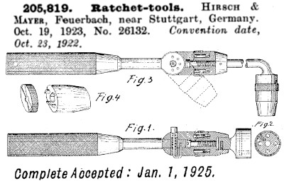 Features appearing to correspond to aspects of this design appear in ratchets distributed as "ALL-IN-ONE" by Emil Schwarz (Chicago). That set has been connected to U.S. 1,629,205, DE-425,020, etc. |