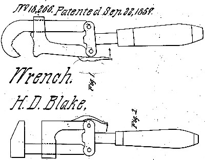 The adjustable jaws are arranged in a rough parallelogram. A thumb piece extends toward the handle on the inner jaw segment. Motion of the "T" shaped handle segment opens or closes the jaw opening. Both pipe and nut wrench applications are shown in the patent drawing.