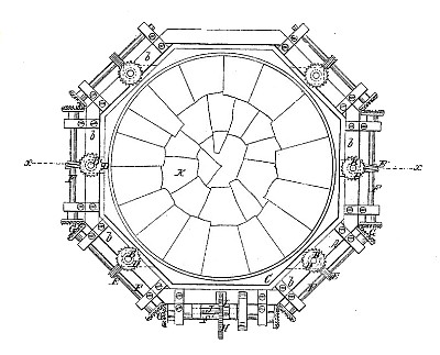 The connecting of the several nuts D of the screw-rods B to a common driving-shaft J, substantially as shown or in an equivalent way, when said screw-rods and nuts are employed to sustain a platform C for the purpose of lowering piers into the water during the course of construction. |