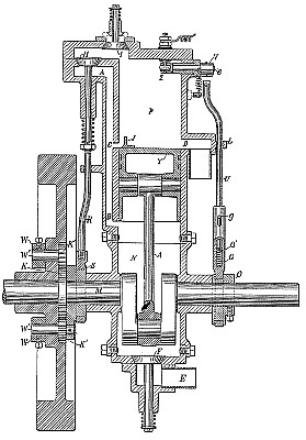 The invention subject of my present application is an improvement in gas-engines, more particularly of the class known es two-cycle explosive-engines, and has for its main objects to simplify end improve the construction of such engines, to increase their efficiency, and to provide for better regulation of the same, especially with a view to rendering them more available in small sizes for use in the propulsion of vehicles und other analogous purposes.