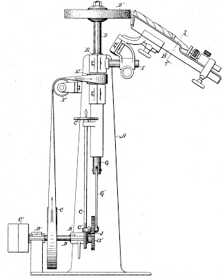 | This drill grinder is designed to use the standard flat disc-shaped grinding wheel rather than the more expensive and less common cup-shaped wheel. The design is an evolution of that of patent 643,703. |