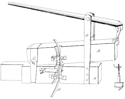 This is a "hot" tire setter: the tire (made of wrought iron) is heated to red hot before using the device of this invention to circumferentially compress the band to shorten it. This patent was reissued twice as RE887 and RE888, representing a division of the original patent. |