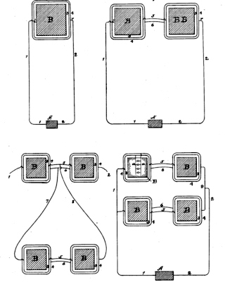 The patent claims: "In a system of electrical distribution, the combination, with positive and negative service-conductors laid entirely around each block of a district, of feeding-conductors, each connected with one of said positive and negative conductors at points on opposite sides of each block electrically equidistant from the central station, substantially as set forth."