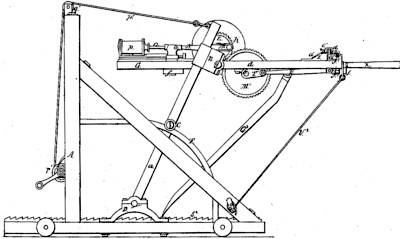 | In this invention, a rock drill uses a drill rod that passes through a hollow steam-engine piston, and a mechanism alternately grasps the rod and throws it forward. This mechanism works in any orientation as compared to the gravity-powered drills that were common at the time. Couch's assistant, Joseph W. Fowle, would improve on this design by connecting the rod to the cross-head of the engine: see patent 7,972. |