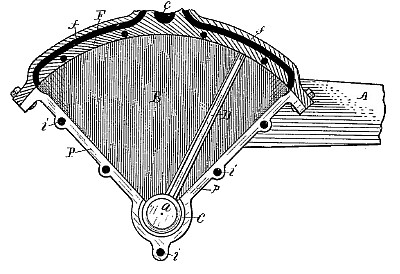 The steam -chest, having the semi-cylindrical bushed shaft-bearings at the juncture of the radial side enclosures of the chest, the rock-shaft, and its radial plate, said shaft being passed through the chest and in said bearings, and having no other hearings, each end of the rockshaft without the chest being provided with a connecting-rod crank. |  |