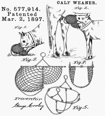 A wire muzzle with stiff heavy gauge wire frame; the specifications discuss problems of other "wire muzzle" type weaners this design addressed. A portion of the muzzle only provides "side protection," allowing the animal to graze and drink.