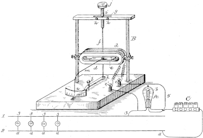 | This patent covers an application of what became known as the Edison effect. Thomas Edison had noticed that if a metal plate is put inside the glass envelope of a light bulb, current can flow from the filament to the plate, provided the plate is given a positive charge and not a negative charge. What Edison had created was the first vacuum tube and the first rectifier, or diode. This invention was decades ahead of its time and it is only in hindsight that we recognize its significance. Edison did nothing with it, nor did anyone else. |