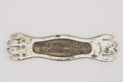 | This wire stripper was manufactured as the "Climax Wirescraper / Pat. April 29, 1902 / Amboy Works, Perth Amboy, N. J." Some examples do not have the last part that identifies the manufacturer. |