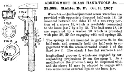 Patent for the combination quick and screw - adjust wrench mechanism corresponding to U.S. patents 855,891 and 999,034. Kahle produced the wrench at Oil City, PA.