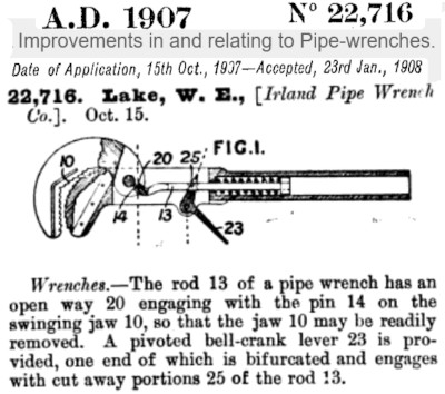 | British patent corresponding to U.S. patent 868,126. As noted in that entry, seven inch examples of the IRLAND PIPE WRENCH appear to incorporate features of this design.