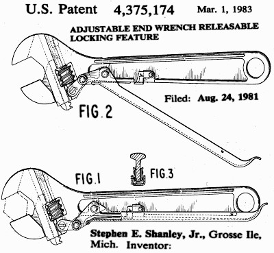 | The patent is for a lever handle and linkage which tightens and can lock the grip of of the movable jaw on a "Crescent" type adjustable end wrench. Distributed as the "Tru-Grip Wrench." A 1985 ad lists three sizes: 8, 10, and 12 inch.