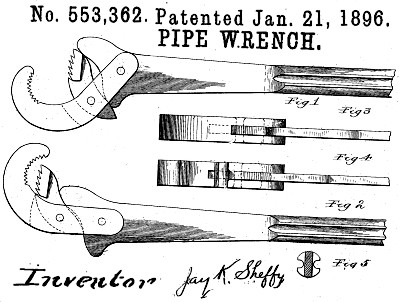 US Patent: 553,362 https://www.datamp.org/patents/displayPatent.php?id=21624&pn=553,362 Pipe Wrench Patentee: Jay K. Sheffy - Chicago IL Granted:1896-01-21