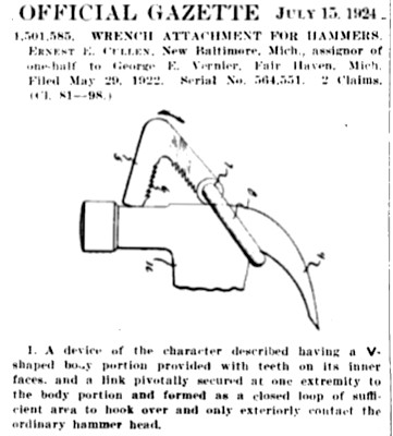 See also patent 1,501,586. Cullen's patents for wrench attachments for claw hammers were noted in 1924 trade journals. Corresponding Canadian patent CA-231,925 was granted June 12, 1923. Rex Frye - patent attorney
