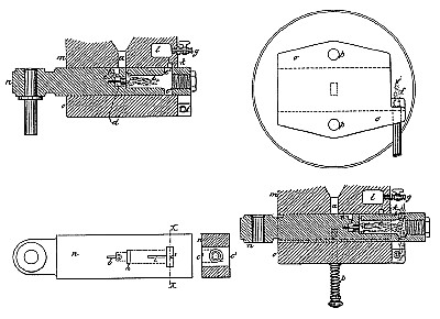Patented in England, 19 Jan 1887, #847; in Belgium, 03 Feb 1887, #76,214 and in Italy, 24 Feb 1887, #XLLI, 8. Abstract: This invention relates to an improved construction of apparatus for igniting the charges of those gas-motor engines in which the charge is subject to compression before ignition. The apparatus consists of a slide that is pressed against a slide-face of the cylinder by means of a loose cover acted on by springs, and is worked by suitable gearing from the engine-shaft. Claim: Igniting apparatus for gas-motor engines, consisting of a slide, n, having a channel, b, communicating by a small hole, c, with a chamber, that in its turn communicates by an annular opening, cl, with a passage, c, having opposite lateral openings a' e , the passage e being made to communicate with the firing-port of the engine by a passage.