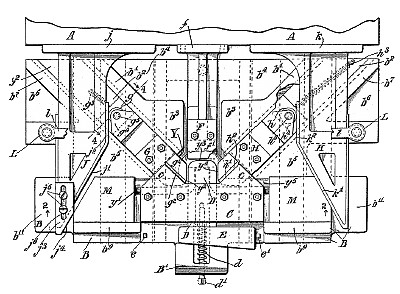 Patented in Canada, #CA-152152. Abstract: My invention relates to apparatus for forging crank shafts, and more particularly to a set of dies and their fittings and supports adapted to be operated by power for the bending and forging of crank shafts. The apparatus herein to be disclosed is shown of a nature permitting it to be employed on various power operated machines or presses whether horizontal or vertical, such for example as the ordinary punching press or a hydraulic press or the machine know n as a bulldozer; there being in each instance a reciprocating part such as the crosshead of the bulldozer, with which certain of the die mechanism cooperates, and a stationary member to which other parts of the die mechanism are secured. The present improvements are particularly intended to be operated by power in one way or another. An object of the present invention is to enable the production of crank shafts with full stock at the corner of the bends and in an efficient and satisfactory way, this being one of the problems with which forge shops have always contended. Another object is to permit the bending of the shaft and the upsetting or the formation of full stock at the corners in a single operation and by the single apparatus hereof. Crank shafts made in a drop forge have required a tedious and expensive operation and machinery. the finished shaft being forged down out of large sized material and the material thereby considerably distorted. Claim: In a crank shaft forging apparatus, the combination of an actuator adapted to make a forward stroke, mechanism actuated by said actuator operative in the first part of each forward stroke for producing all the bends of the crank, and mechanism actuated by said actuator operative in the last part of each forward stroke thereof for upsetting the corners by displacing the crank wrist relatively toward the shaft line. 2In a crank shaft forging apparatus the combination of a movable actuator or head, a shaft bending means for making all the bends of the crank, connections whereby the actuator actuates said bending means, and an upsetting die for displacing the crank wrist toward the shaft line after said bending means has bent the shaft, and connections whereby the actuator actuates said die, said respective connections being such that a single operation of the actuator causes the operations in the order named.