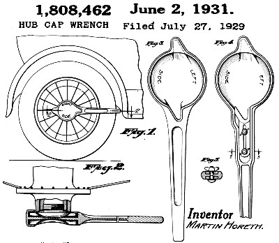 US Patent: 1,808,462 https://www.datamp.org/patents/displayPatent.php?id=84728&pn=1,808,462 Hub Cap Wrench Patentee: Martin Horeth - Brooklyn NY Granted:1931-06-02