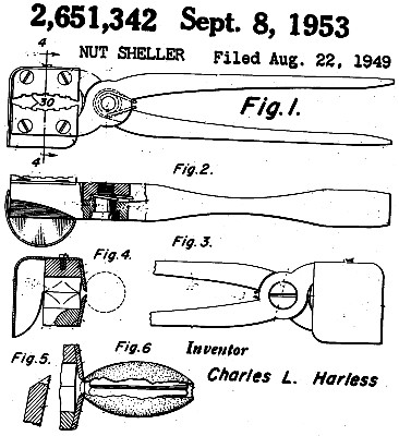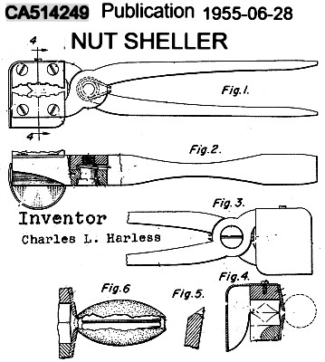 CA Patent: 514,249 https://www.datamp.org/patents/displayPatent.php?id=85284&pn=514,249 Nut Sheller Patentee: Charles L. Harless - San Angelo TX Granted:1955-06-28