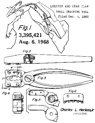 US Patent: 3,395,421 https://www.datamp.org/patents/displayPatent.php?id=85285&pn=3,395,421 Lobster and crab claw shell cracking tool Patentee: Charles L. Harless Jr. - San Angelo TX Granted:1968-08-06