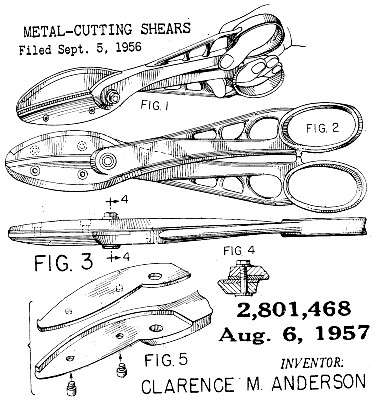 US Patent: 2,801,468 https://www.datamp.org/patents/displayPatent.php?id=85361&pn=2,801,468 Metal-cutting shears Patentee: Clarence M. Anderson - Chicago IL Granted:1957-08-07