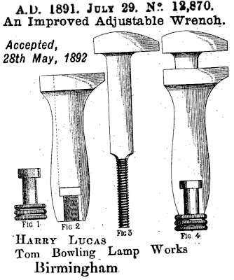 GB Patent: 189,112,870 https://www.datamp.org/patents/displayPatent.php?id=85421&pn=189,112,870 An Improved Adjustable Wrench Patentee: Harry Lucas - Birmingham England Granted:1892-05-28