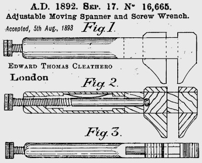 The adjusting screw is held against a threaded portion of the central bore by a spring. Moving the screw against the spring pressure allows for sliding quick adjustment. The screw has a pivoting connection to the adjustable jaw. A listing for "Cleathero Wrench" in an 1894 catalog hints this may have seen limited producton. Note: British patents (pre 1916) were numbered by the year and started at patent #1 at the start of each year in January. The patent # used in DATAMP represents the year of registration and the patent # (with leading zeros to make the number total nine digits). This patent is #16,665 of the year 1892.