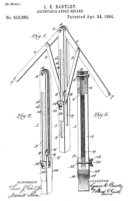 US Patent: 518,685 https://www.datamp.org/patents/displayPatent.php?id=85523&pn=518,685 Adjustable Angle-Square Patentee: Louis K. Bartley - Winona MN Granted:1894-04-24