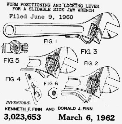 Improvement to the design in 2,657,606 to include an internal "retaining" clip for the side handle, along with other refinements. The patent reflects the FINN TOOL Co. adjustable wrench with supplemental "crank" and adjustment lock.