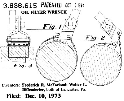 The patent number appears on a K-D "band type" oil filter wrench sized for filters with external diameter just over 4." |