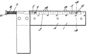 This square features two rows of teeth built into the spine of the blade. Actuating a lever in the square stock moves these teeth, thus marking the stuff and obviating the need for a pencil.
