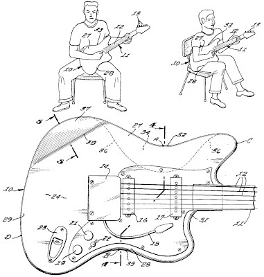 This patent covers aspects of the Fender Jazzmaster guitar and the similar and slightly later Fender Jaguar. The patent specification describes how a guitar is held: at that time the guitar was played in a seated position and a strap was not used. The patent covers improvements to the shape of the guitar to make it more comfortable to play while seated. At about this time guitar players were transitioning to playing while seated, and the sculpted body shape would prove to be less important for those who play while standing.