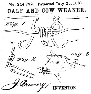 Structure of bent wires, including a "safety pin" type attachment through the nose cartilage. The specifications include mention of appropriate gages of tinned wire for "calf" and "cow" versions. Mentioned in the specifications for 261,096.
