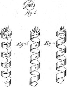 | "My improvement is applicable to bits and augers of the kinds known as the 'double and single twist,' and consists, as applied to the latter, in uniting the end of the helical rod where it terminates in the cutting lip, with the preceding coil so as to constitute what I term the 'supported cut,' and form an arch over the cavity of the helix, for the support of the conical screw." |