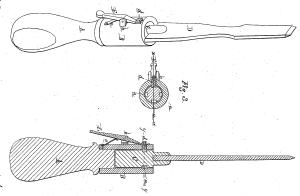 | Utilizes a pawl and lever in the handle to allow the blade to ratchet in either direction depending upon the how the pawl stud is inserted into the handle due to the bevel at the end of the pawl.