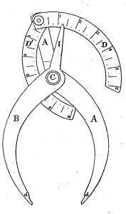 | This caliper design feature a pair of adjustable graduated arcs, one for reading inside measurements and one for reading outside measurements. |